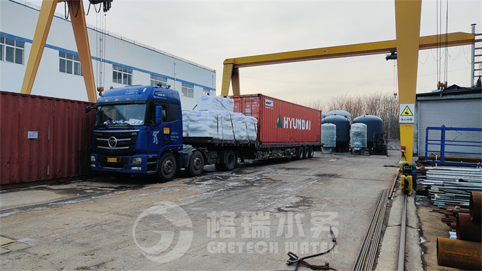 此次發(fā)貨的是工程濾料、膜元件、EDI模塊等設備,滿裝5輛大車運往連云港港口,格瑞水務設備智能、高效、節(jié)水節(jié)能、品質(zhì)優(yōu)良。